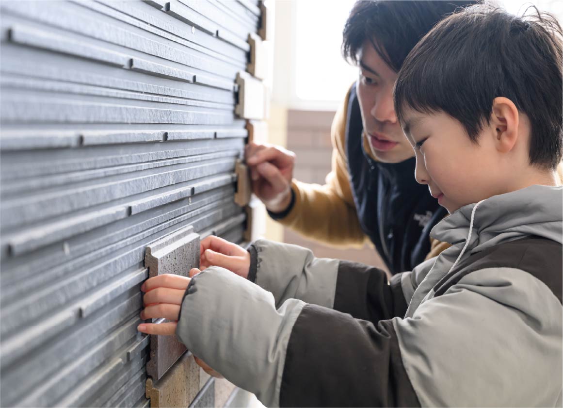 次は、タイル屋さんの教室にやってきました。ここでは、外壁のサイディングにレンガタイルを貼るおしごとが体験できます。