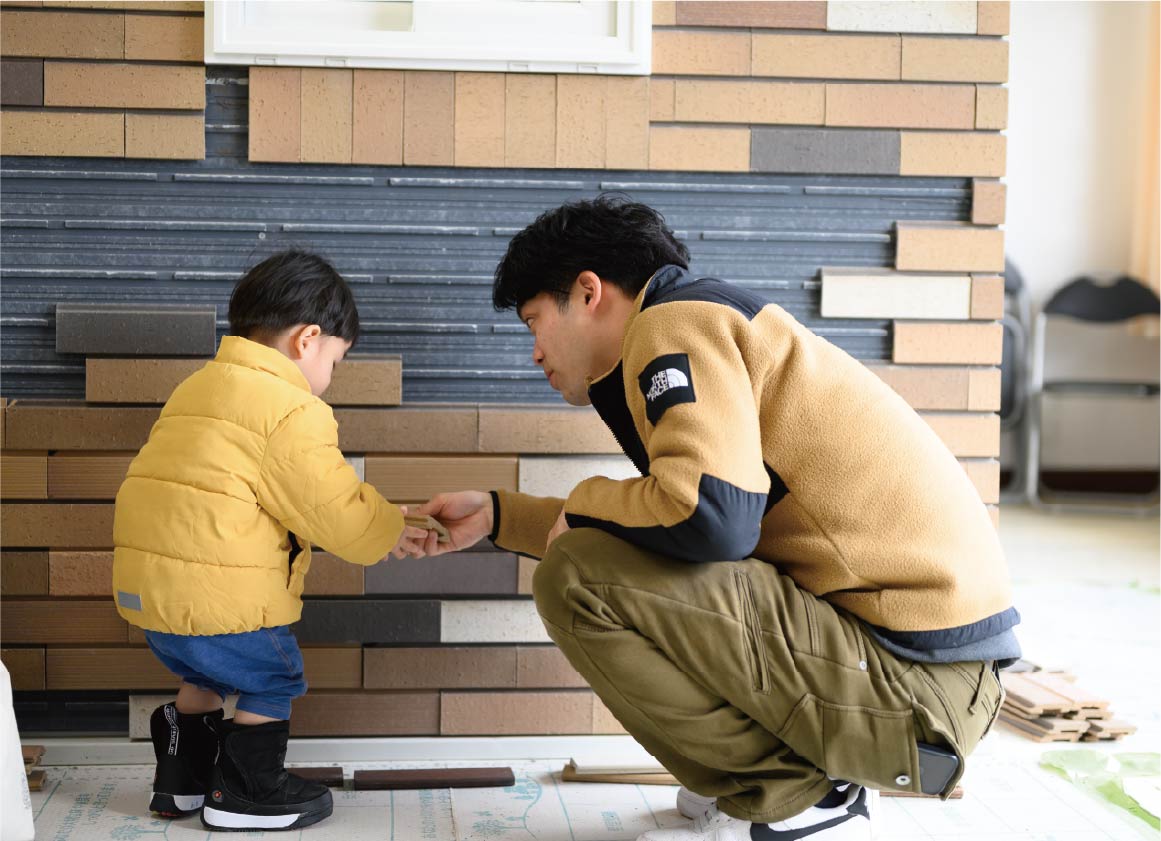 スモリの家の外壁は、こんなふうに職人さんが丁寧にレンガタイルを貼っているんだなあと、職人さんのおしごとへのありがたみも感じる体験です。