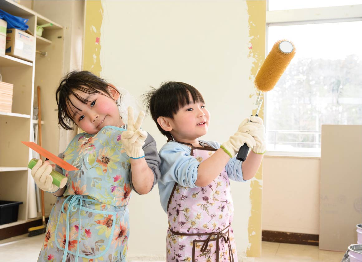 体験するお子さんたちは、エプロンと軍手姿になって、コテやローラーで塗り壁を塗っていきます。