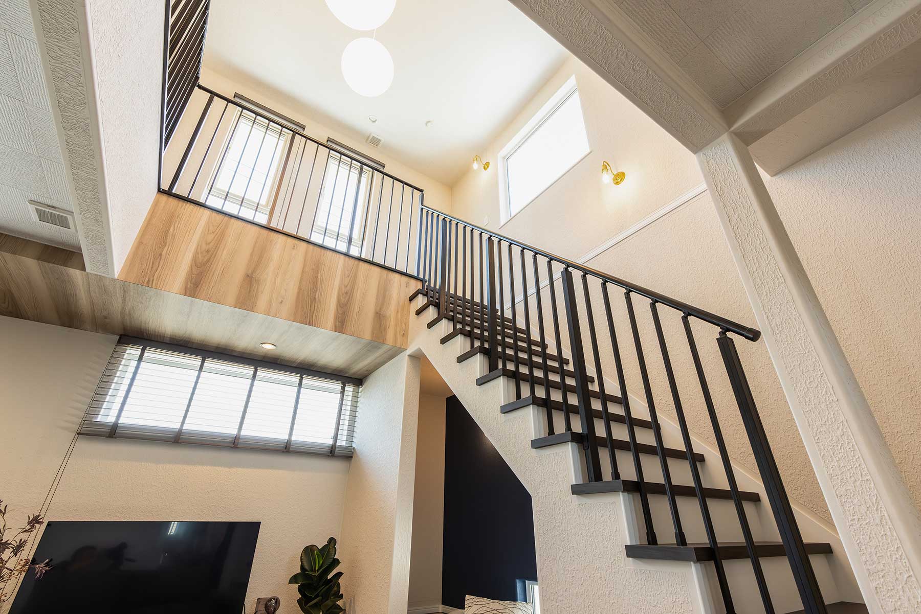 都会的なデザインと自然素材の温もりが調和する本展示場は、家事楽動線やくつろぎのスペースなど、暮らしやすさを重視した間取りとなっています。玄関からリビングに続く表動線を進むと、リビング上部の吹き抜けで縦方向に広がりをつくったLDKが。スケルトン階段と階段下を活かしたヌックスペースで、圧迫感を感じさせない空間づくりがなされています。また玄関からシューズクローク・パントリーに続く裏動線も確保し、その動線は浴室やランドリールーム、WICにもつながっています。