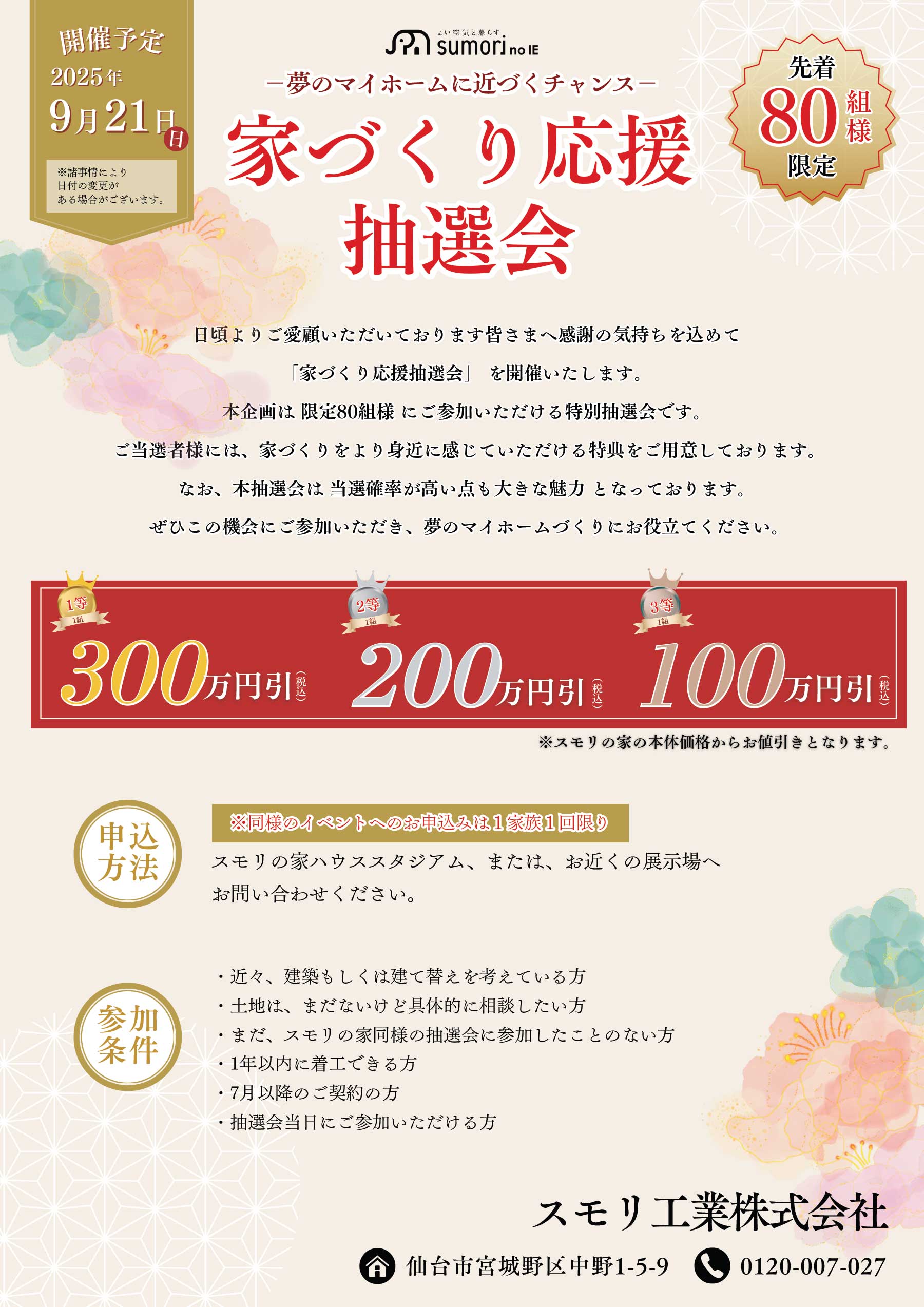 9月21日(日)、これからマイホームを持ちたい先着80組様を対象に「家づくり応援抽選会」を開催いたします。当選者様には、スモリの家の本体価格の値引き特典をプレゼントいたします!本抽選会は、当選確率が高い点も大きな魅力となっております。ぜひこの機会にご参加いただき、夢のマイホームづくりにお役立てください。