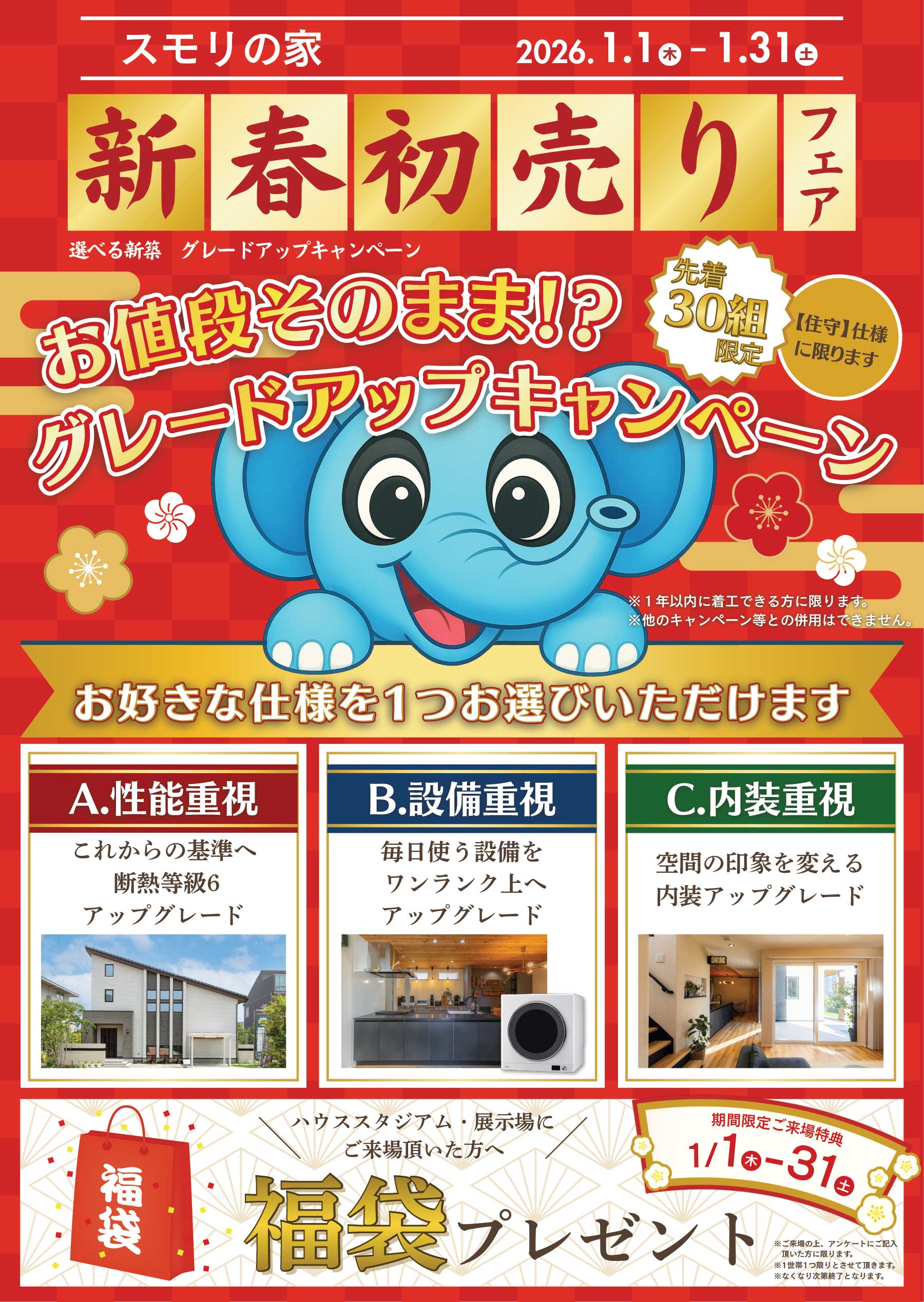 キャンペーン開催期間中、ハウス・スタジアム、各展示場へご来場いただいたお客さまには福袋をプレゼント!家づくりのご相談はもちろん、情報収集も大歓迎です。