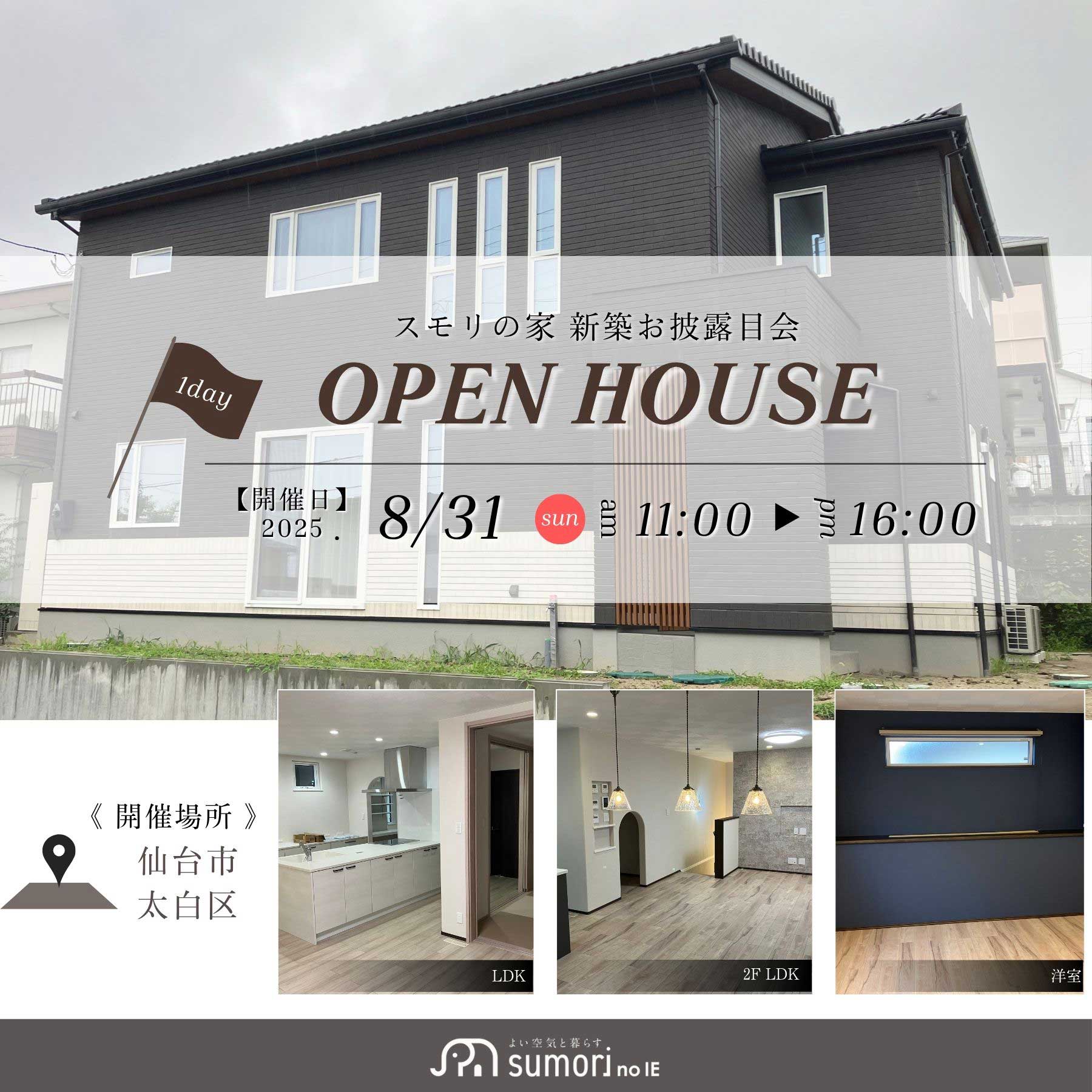 8月31日(日)は、仙台市太白区内の2会場にて開催いたします。八木山本町が会場となるお宅は三世代が同居する二世帯住宅で、1階3LDK、2階4LDKの間取りとなっています。内装は、スモリらしさを感じる塗り壁と丸みを帯びた垂れ壁に、クッションフロアやクロスがほどよいアクセントを与える、落ち着きのある雰囲気。高級感のある玄関、造作カウンターや間接照明のある主寝室、お子さまの遊び部屋にぴったりのリビング併設のヌックなど、見どころが満載です!