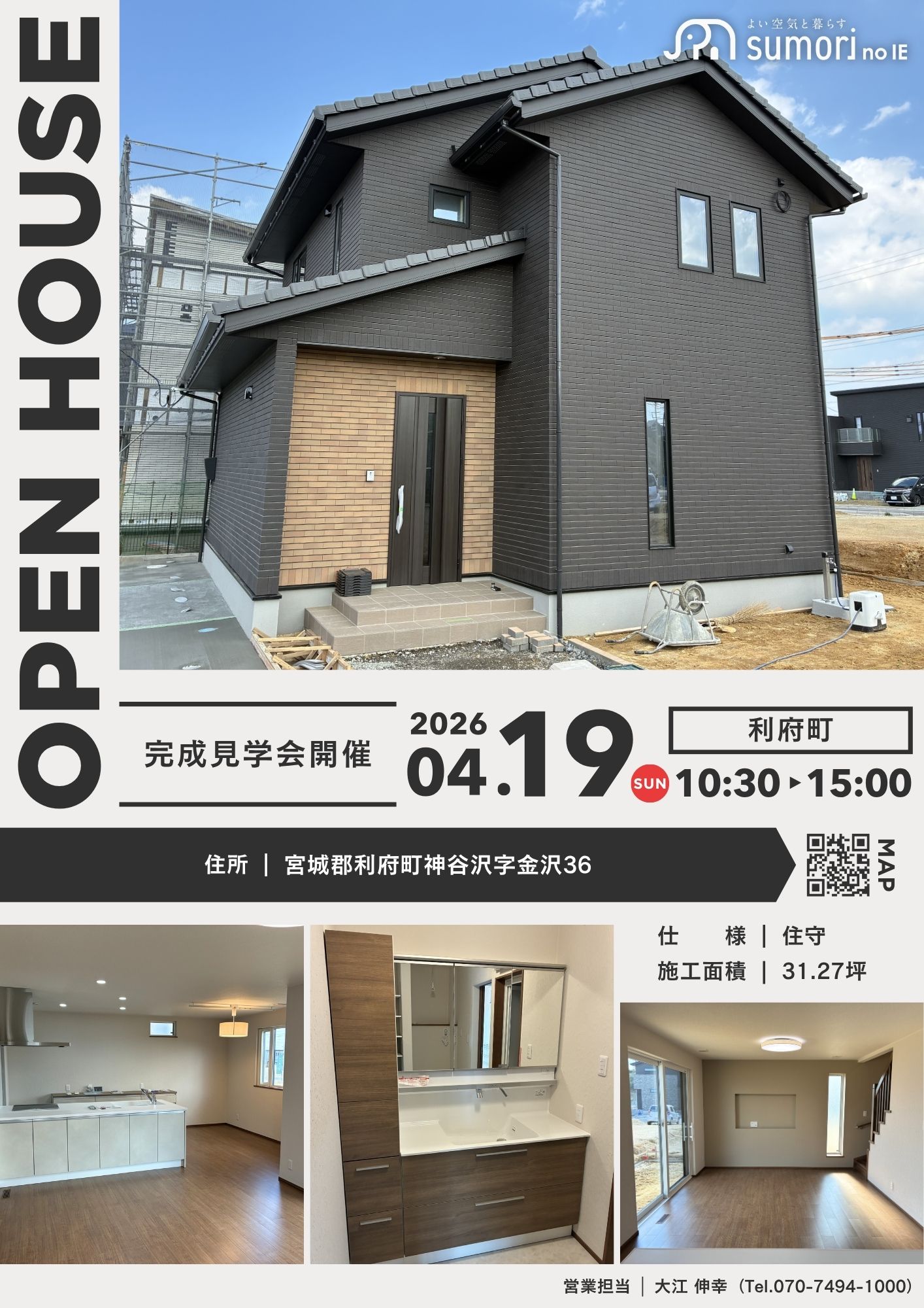 4月19日(日)は、利府町にて開催いたします。チェックポイントは、31坪には感じられない充実した間取りの工夫です。2階建ての3LDKは、玄関を開けてすぐの水回りや回遊動線、廊下を減らした分広く確保したLDK、スペースに余裕を持たせたパントリーや洗面脱衣所など、空間のメリハリと暮らしやすさを実感させるアイデアがいっぱいです。